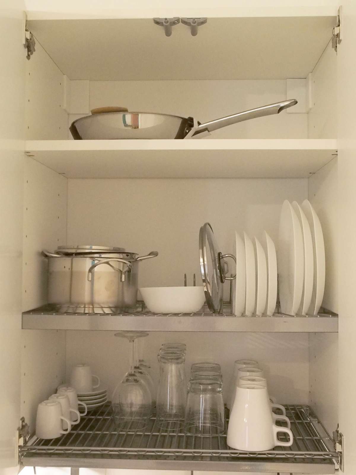 Kuhinja je opremljena z majhnim hladilnikom, pomivalnim koritom, mikrovalovno pečico in prenosnim električnim štedilnikom.