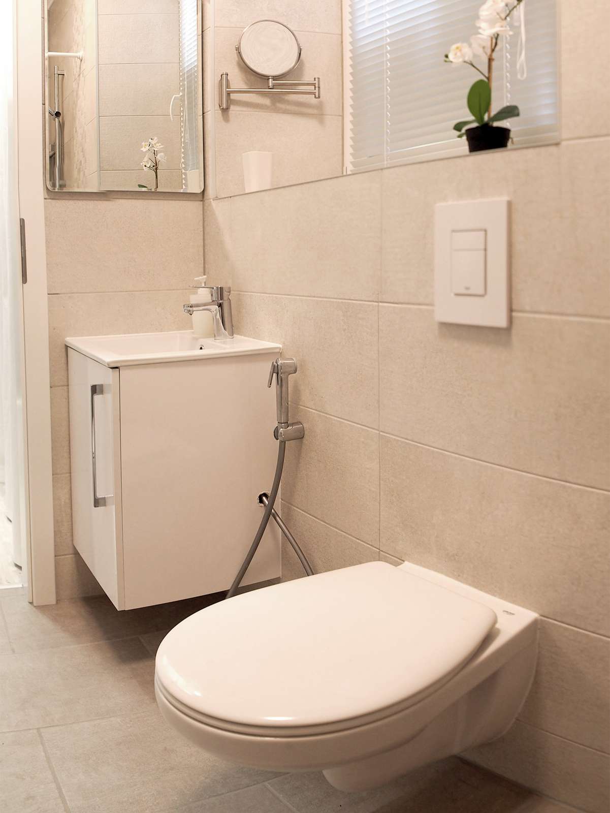 Zasebna kopalnica ima prho, električni stojalo za brisače in sušilec za lase.